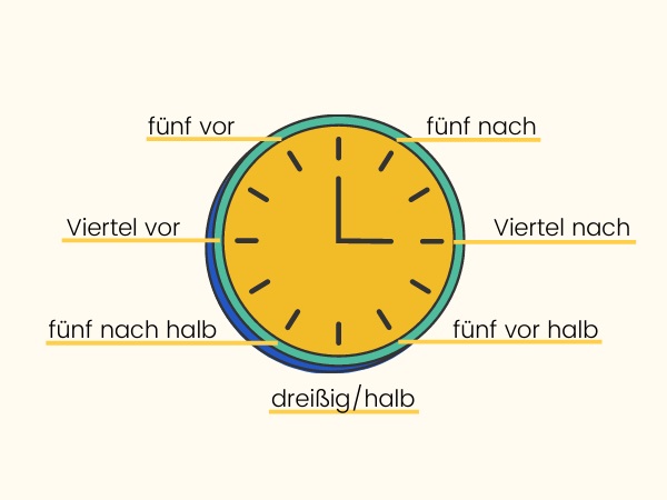Pastaba: „Halb“ reiškia „pusė“. Šis formatas yra itin populiarus neformaliame bendravime ir padeda greitai apibūdinti artėjantį laiką. Jis ypač naudingas, kai kalbama apie laiką tarp dviejų pilnų valandų.